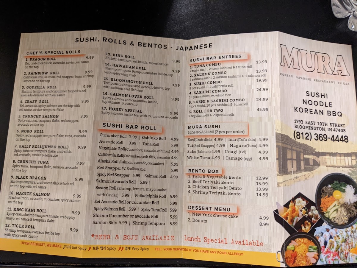 Whether you're indulging in a sushi roll, enjoying a Korean soup, or savoring a Bento Box, Mura Sushi & Korean Restaurant provides a diverse and flavorful experience at every meal. With its affordable prices and wide-ranging menu, it's a perfect spot for a satisfying dining experience in Bloomington.